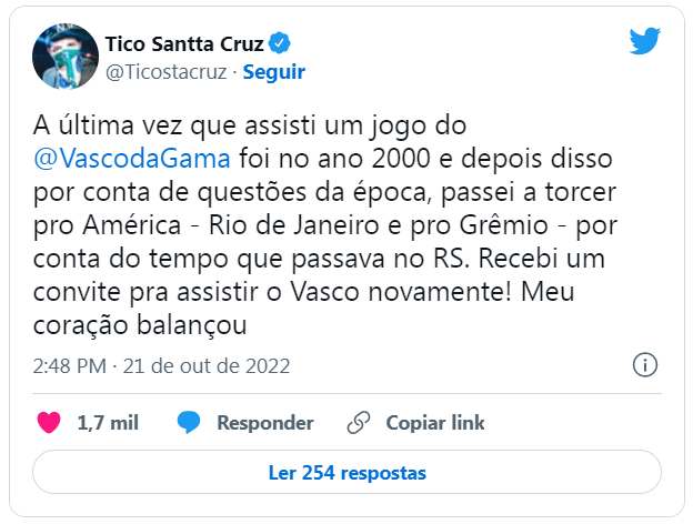 Após dizer que mudou de time, Tico Santta Cruz recebe convite para ver o Vasco e admite que 'coração balançou'