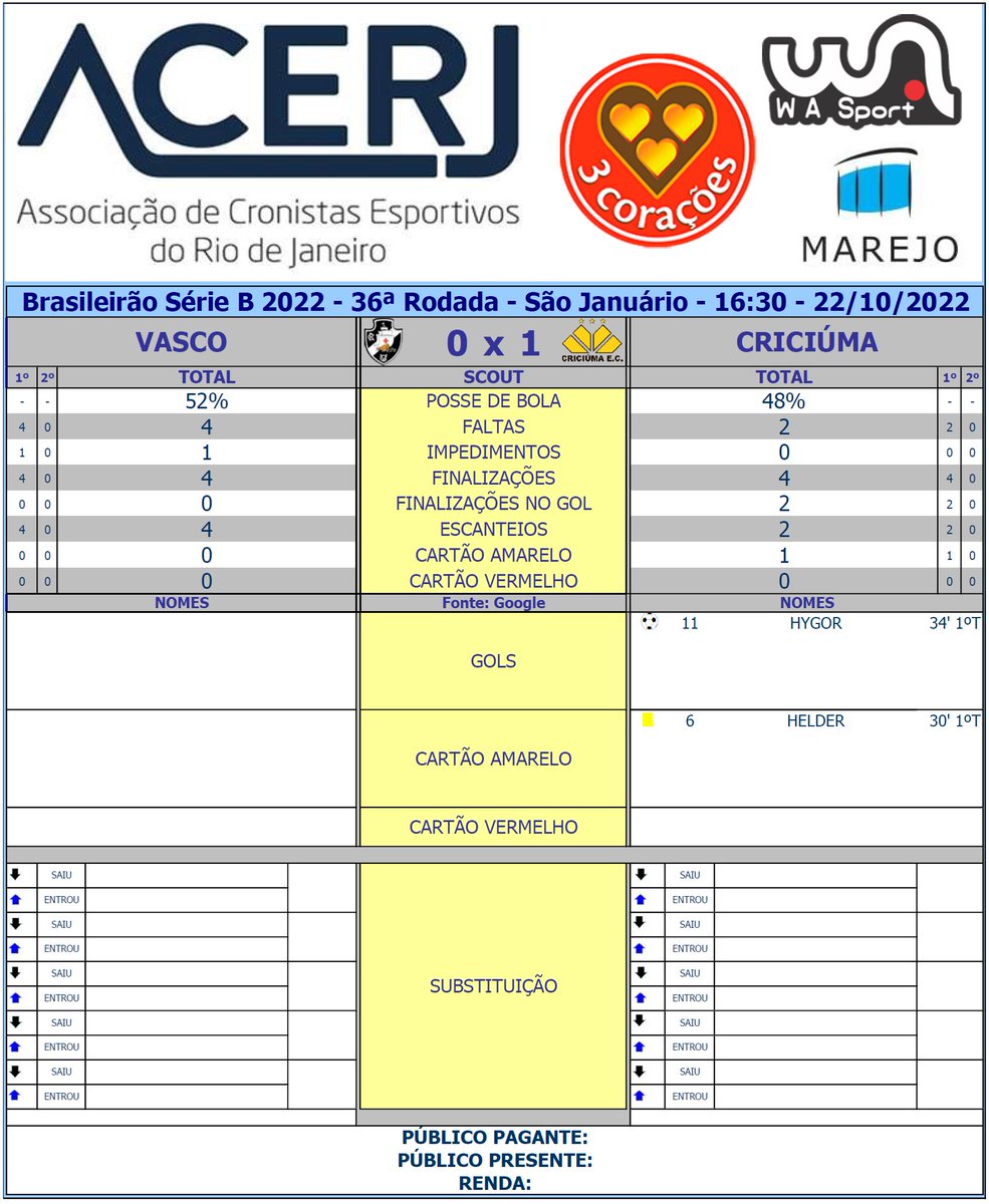 Scout do 1º Tempo de Vasco e Criciúma pela 36ª Rodada do Campeonato Brasileiro da série B 2022 em São Januário (Fonte: Google) #Acerjinforma #BrasileiraoSerieB #VASxCRI #Vasco #CriciumaEC @BrasileiraoB @VascodaGama @CriciumaEC