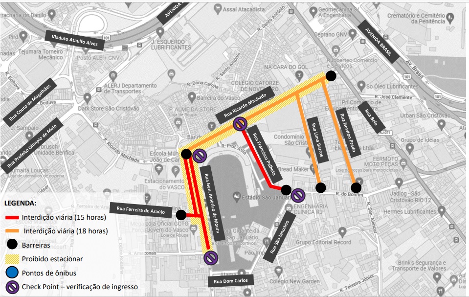 As Ruas Gal. Almério de Moura, Ferreira de Araújo e Francisco Palheta serão interditadas para veículos às 15h, como forma de melhorar a organização do entorno de São Januário. Já as ruas Rua Ricardo Machado, Lima Barros e Newton Prado serão fechadas às 18H.