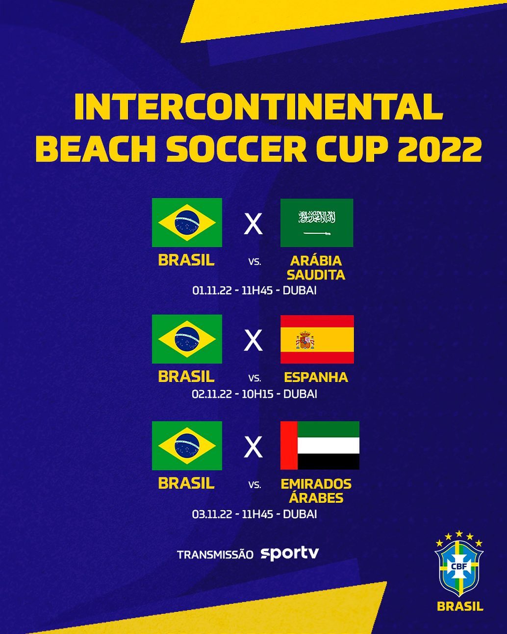Tricampeã, a @brbeachsoccer enfrentará Arábia Saudita, Espanha e Emirados Árabes nos dias 1, 2 e 3, respectivamente.