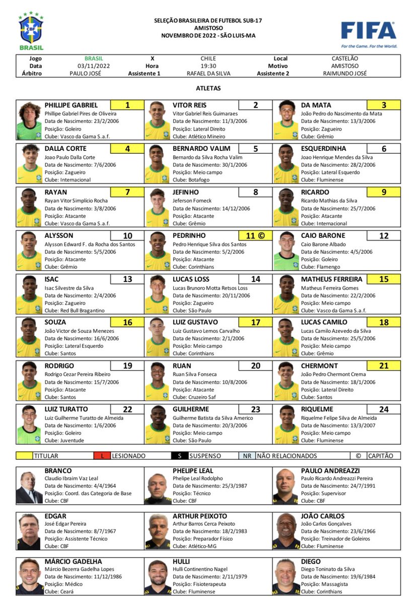 Seleção Sub-17 definida para duelo com o Chile às 19h30, no Estádio Castelão, no Maranhão: