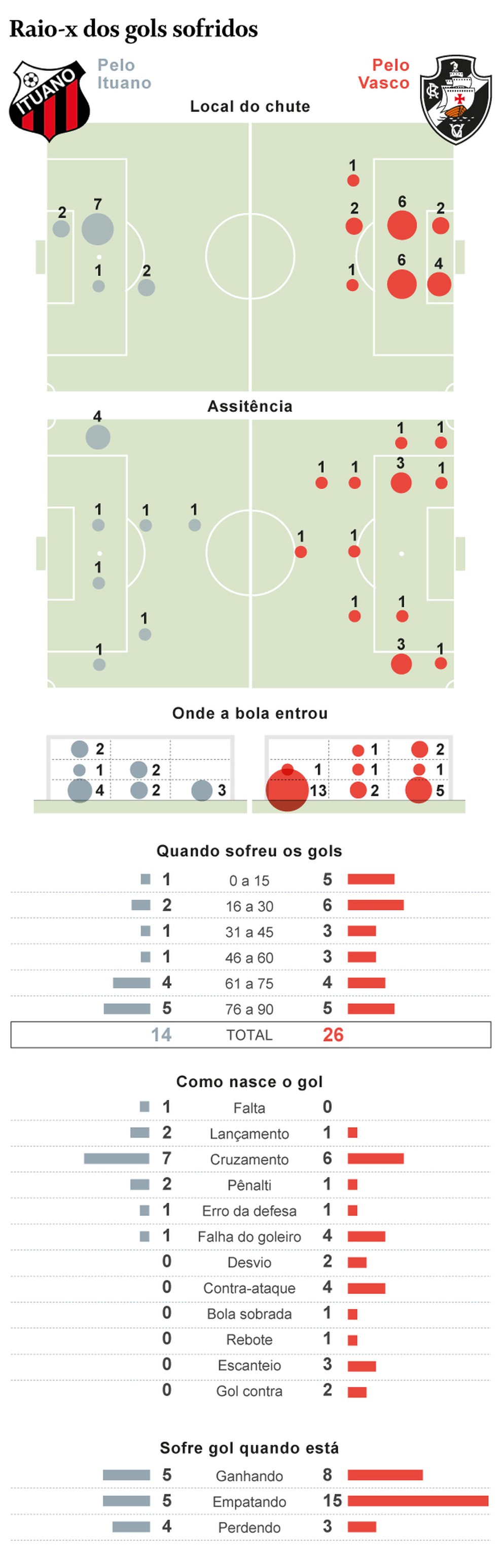 A boa notícia é que existem caminhos visíveis a serem explorados pelos vascaínos. Por exemplo, o Ituano se notabiliza como um clube que sofre muitos gols no terço final de suas partidas, seja por questões técnicas, físicas ou simplesmente por apagões de seu sistema defensivo. Dos 14 gols sofridos pelos paulistas neste segundo turno, nove aconteceram nos 30 minutos finais de partida — cerca de 64% do total.