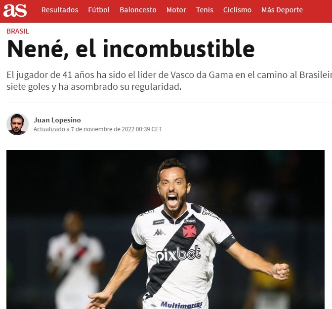O retorno do Vasco da Gama para a elite do futebol brasileiro em 2023 repercutiu na imprensa espanhola. O jornal "As" destacou a campanha feita na Série B e a regularidade do meia Nenê, um dos líderes do elenco Cruzmaltino na temporada, autor do único gol na vitória contra o Ituano que garantiu o acesso.