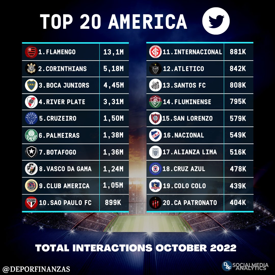📲⚽¡Los 20 clubes de América con más interacciones en #twitter durante octubre 2022!🔃💙💬