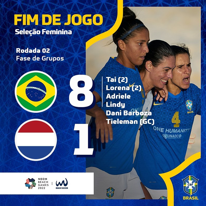 Nesta sexta-feira (11), a Seleção Feminina de Beach Soccer enfrenta a Inglaterra, às 12h30.