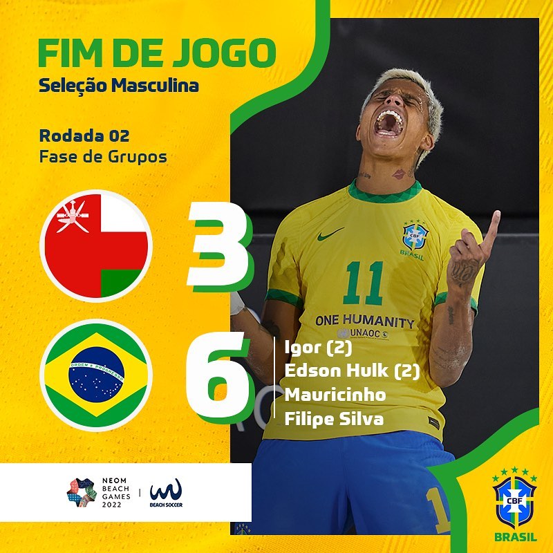 No masculino, triunfo por 6 a 3 contra o Bahrein. Igor (2), Edson Hulk (2), Mauricinho e Filipe Silva balançaram as redes para a Canarinho.