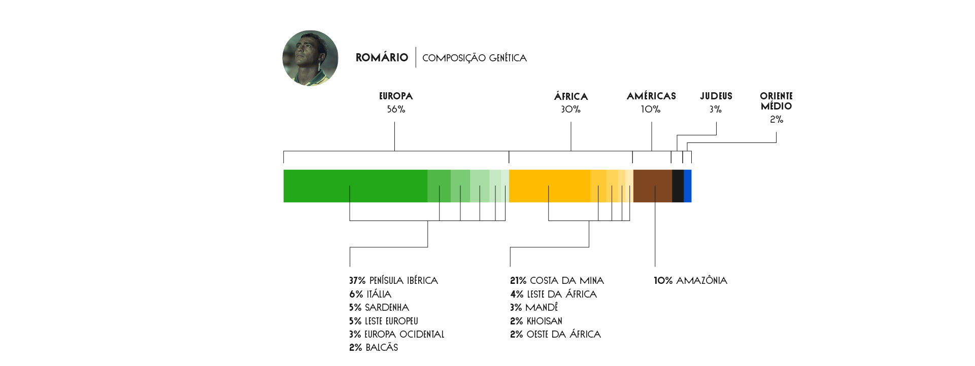 Apesar do carinho com que fala do continente, a África não é preponderante no DNA do baixinho. Representa 30% do material genético dele, que vem de lugares como Costa da Mina (dos países Nigéria, Gana, Togo e Benim), leste (da Tanzânia à África do Sul) e oeste africanos (que compreende de Camarões à República Democrática do Congo), além de etnias como mandê (do Mali à Costa do Marfim) e khoisan (de Angola a Botsuana).