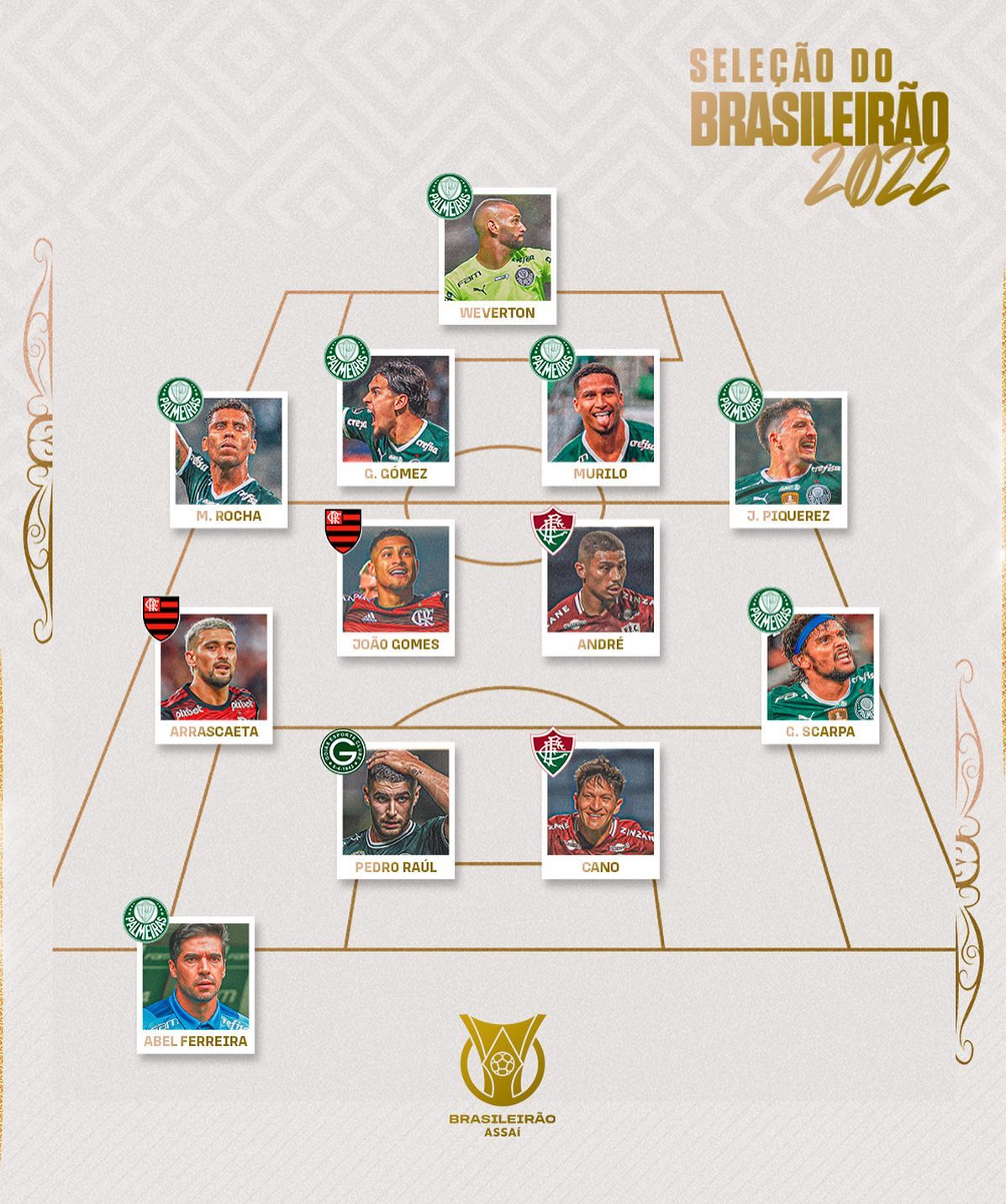 Um timaço! Essa é a seleção do @Brasileirao 2022, eleita por jornalistas, técnicos e capitães! Uma defesa que ninguém passa do @Palmeiras, uma dupla amada pela torcida do @Flamengo e outra pela torcida do @FluminenseFC, o craque do campeonato, do @palmeiras, e o cravador nato do @goiasoficial! Comandados pelo técnico campeão!