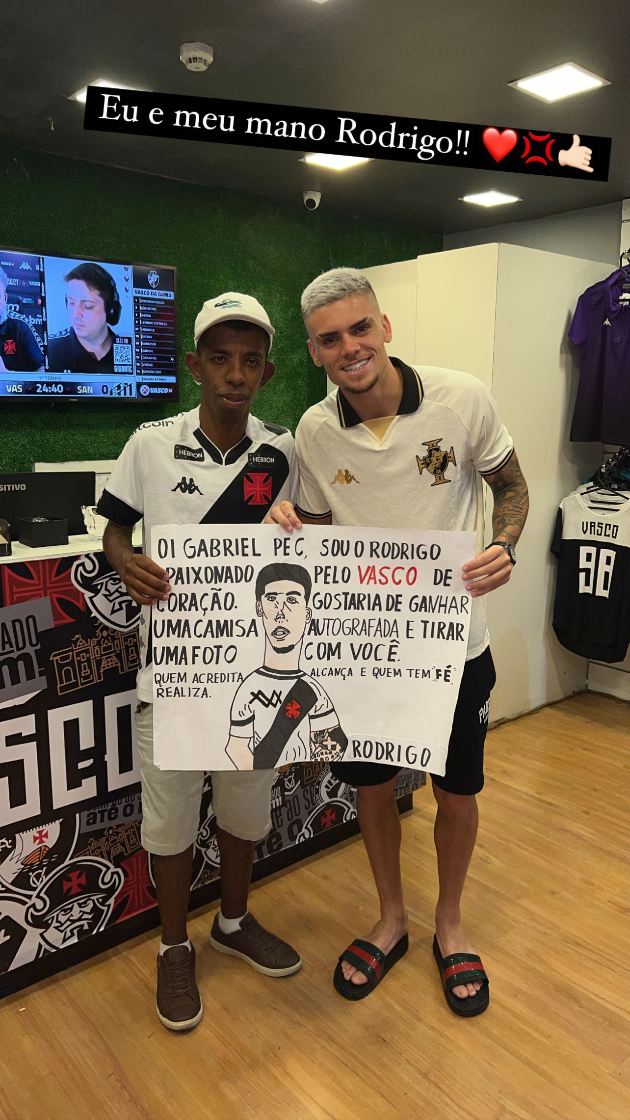 Gabriel Pec se encontra com torcedor que pediu camisa em cartaz com sua caricatura