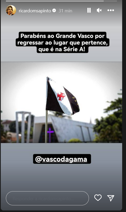 Ex-técnico do Vasco, Ricardo Sá Pinto parabeniza o clube pelo seu retorno à Série A