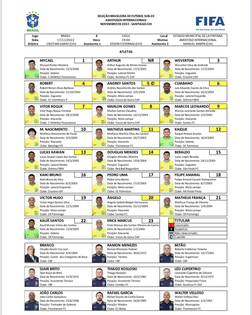 Seleção Sub-20 escalada para amistoso com Chile às 19h, em Santiago #ImprensaCBF