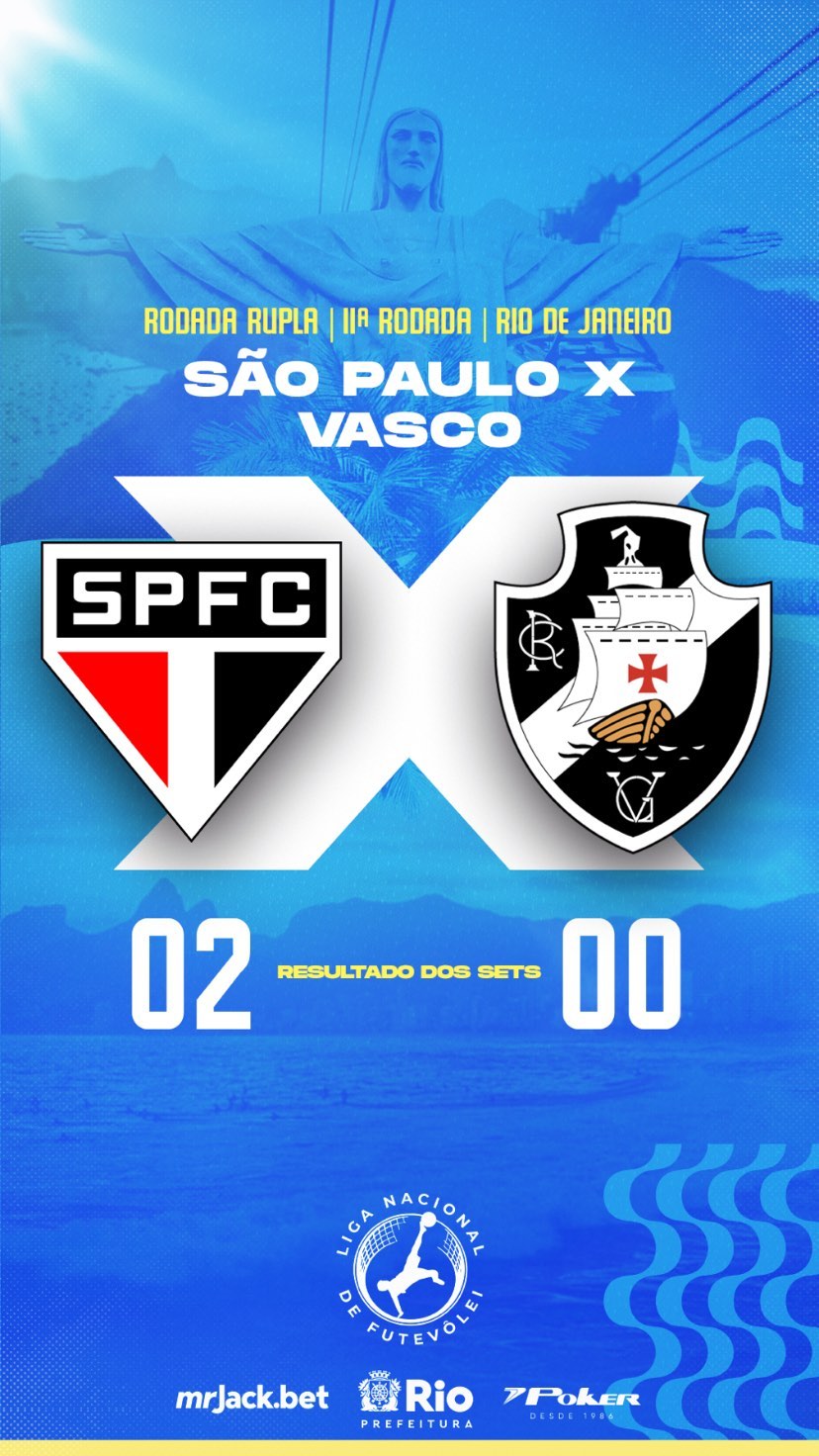 Pela 11ª e última rodada da 1ª fase da Liga Nacional de Futevôlei, o Vasco foi derrotado pelo São Paulo por 2 a 0 na noite da última 6ª-feira no Parque Olímpico da Barra, no Rio de Janeiro. As parciais foram de 18/11 e 18/07. O Vasco já estava fora da briga por uma vaga nas semifinais da competição e, com a derrota, fechou sua participação em 10º lugar. A equipe vascaína contou com Rafael Longo e Renato Augusto. Este último jogou futebol de campo pelo Gigante da Colina de 2010 a 2014 como volante. Júlio César (lateral-esquerdo do futebol de campo do Vasco de 2015 a 2017) também integrou o time, mas não atuou nas rodadas finais.
