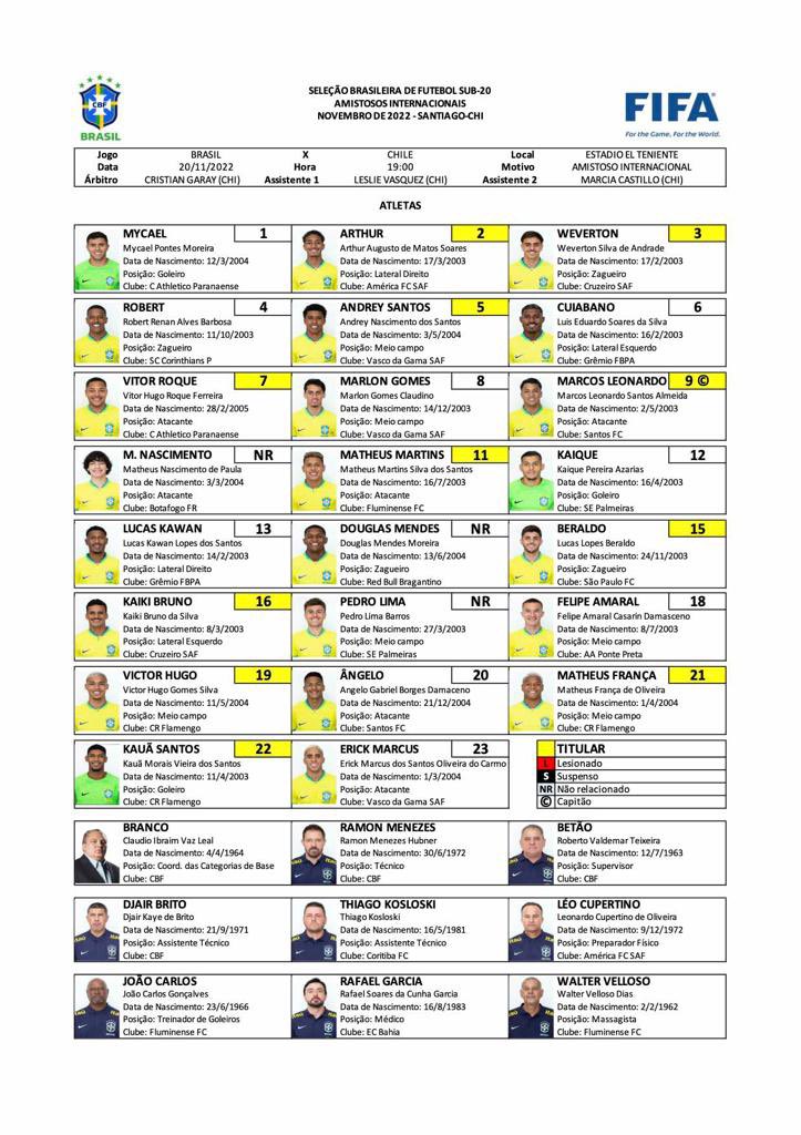 Seleção Sub-20 escalada para amistoso com Chile às 19h, em Santiago: