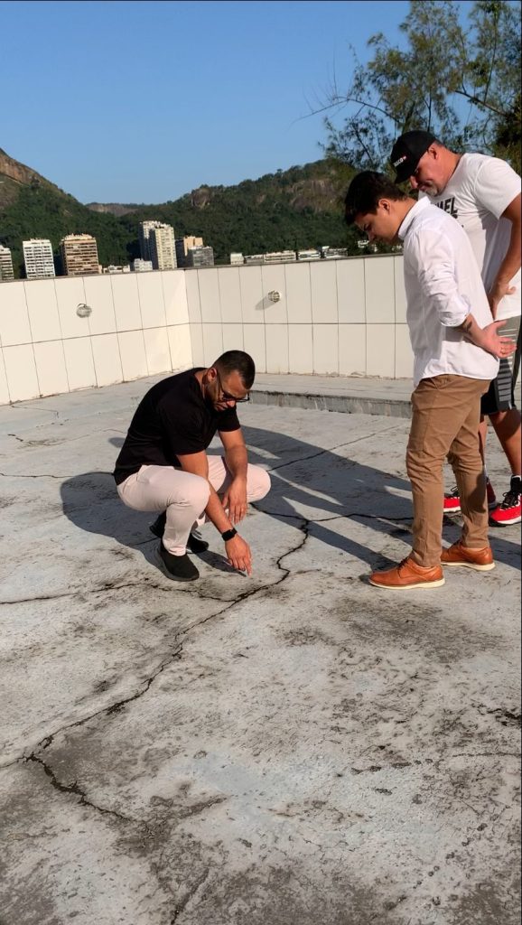 Busquei um parceiro pra estar comigo nessa empreitada, e encontrei o Bruno, da BS Projetos e Construções que é especialista nesse tipo de obra, e juntos com ele, hoje estamos fazendo toda a impermeabilização da laje da sede, o que vai tornar possível a execução de todos os outros serviços que precisam ser feito na parte interna da sede, e que não estavam sendo feitos por conta dos problemas gerados pelas infiltrações. Estamos entrando na fase final da execução desse serviço, e enquanto trabalhamos no terraço, o Zé Colmeia com sua equipe vem fazendo uma reforma total da parte interna, de baixo, pra cima. Reformando a garagem dos barcos, vestiários etc.