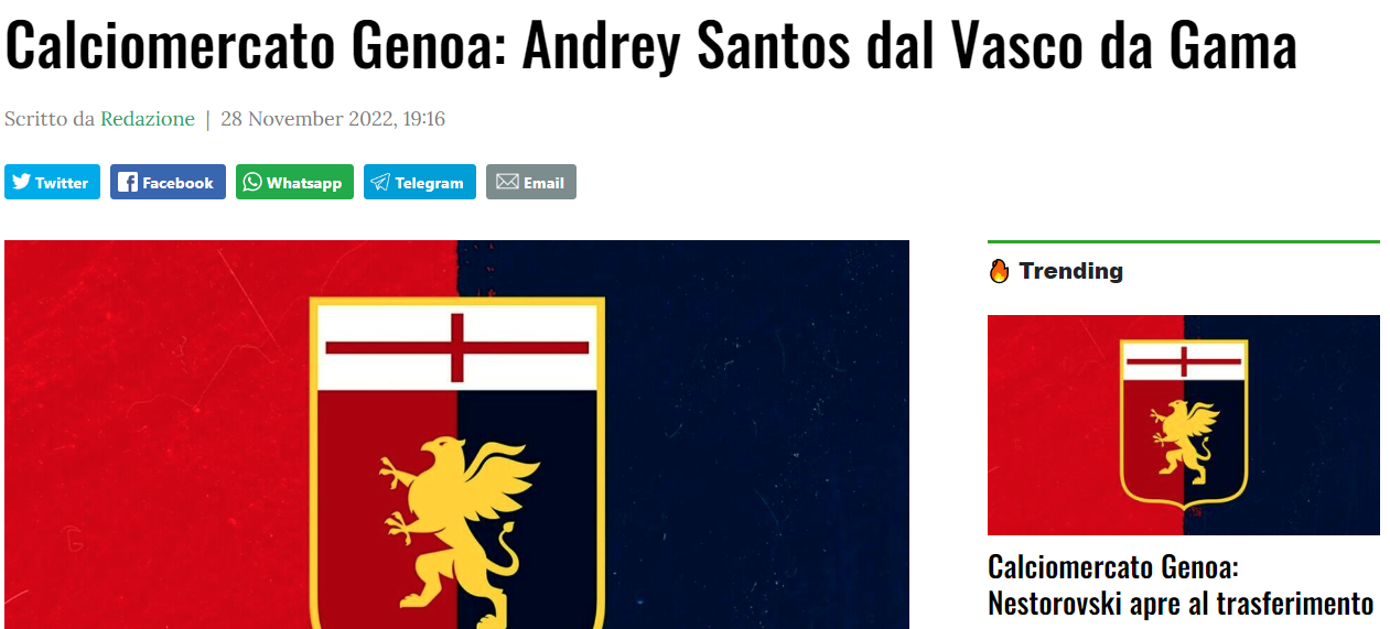 O Genoa pode se tornar o próximo time do talento brasileiro Andrey Santos. O médio centro, capaz de atuar também como médio defensivo, consegue ver a baliza adversária com uma certa facilidade e isso estaria a convencer a direção a avaliar a sua transferência para solo italiano.