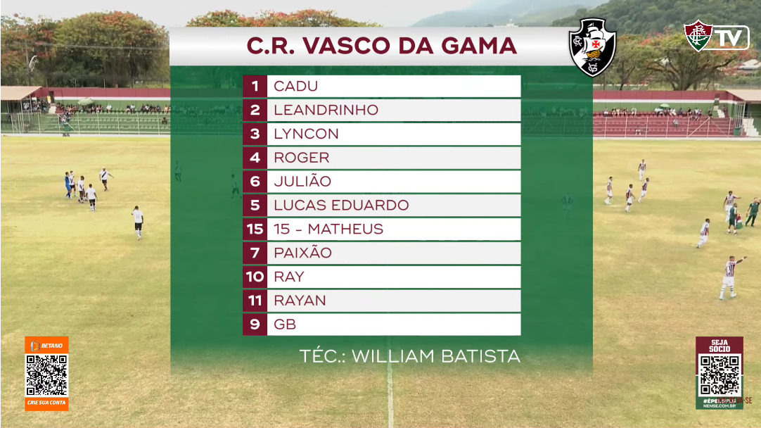 O Sub-20 do Vasco já está definido para encarar o Fluminense, às 11h, pela 'decisão' do Torneio de Xerém. O técnico William Batista mandará a campo: Cadu, Leandrinho, Lyncon, Roger e Julião; Lucas Eduardo, Matheus, Paixão e Ray; Rayan e GB. Transmissão da Flu TV.