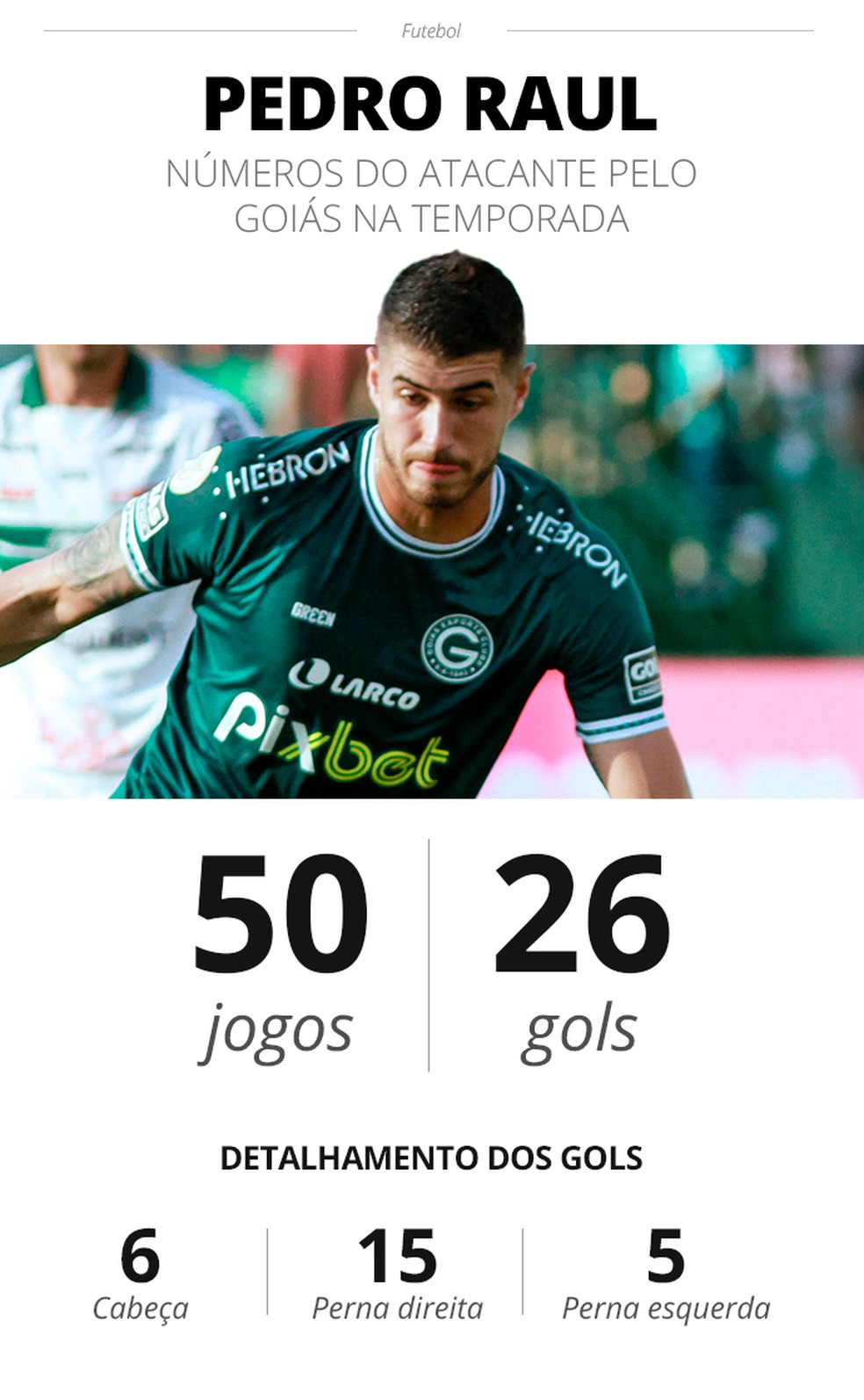 Em 2022, o atacante foi um dos grandes destaques do futebol brasileiro. No Goiás, marcou 26 gols em 50 jogos. Destro, mais da metade dos gols foi com a perna direita, mas, no quesito cabeceio, Pedro Raul também se destaca. Com 1,92m de altura, o atacante marcou seis gols de cabeça - mais do que qualquer jogador do Vasco no ano.