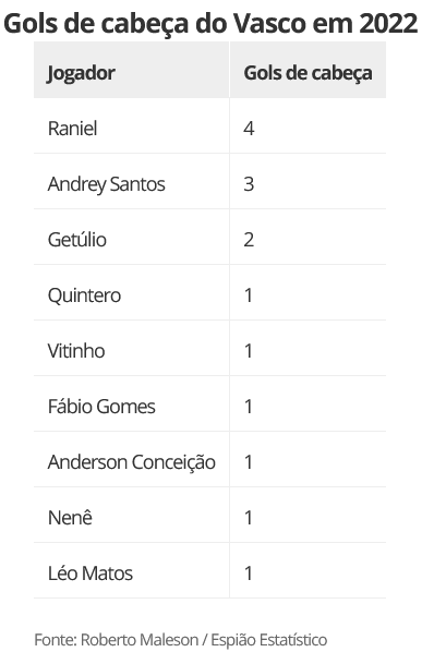 Dos 20 gols com os pés, Pedro Raul marcou em 15 oportunidades de primeira, dando apenas um toque na bola. Outro dado que chama a atenção é que, de todas as vezes que balançou as redes, 11 foram em jogadas aéreas. Pelos números do Espião Estatístico, 55% dos gols marcados pelo Vasco em 2022 também tiveram origem pelo alto.