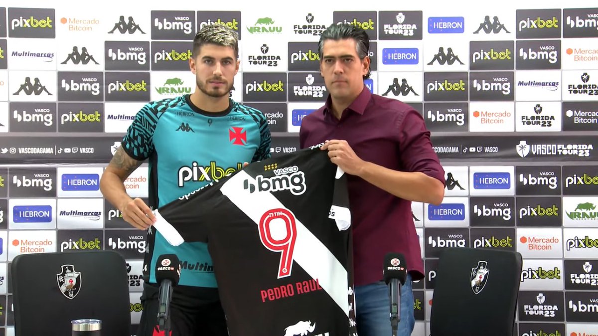 Pedro Raul é apresentado oficialmente pelo Vasco e recebe a camisa 9 das mãos do diretor de futebol, Paulo Bracks.