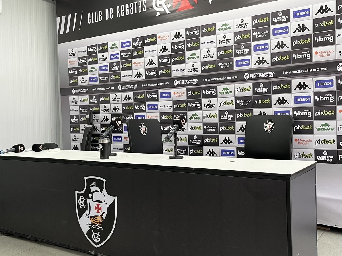 Sala de entrevistas no CT Moacyr Barbosa já está preparada para a coletiva de De Lucca