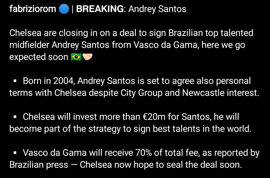 De acordo com @FabrizioRomano, em seu Instagram, o valor da venda de Andrey Santos para o Chelsea é superior a € 20 milhões (R$ 110 milhões).