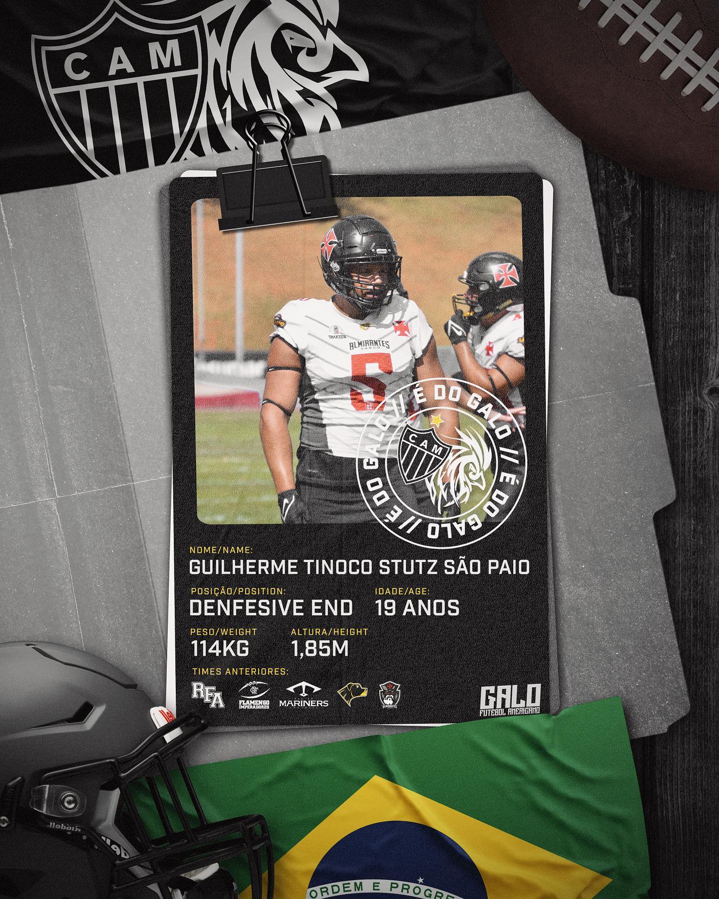 Com passagens no Rio Football Academy, Flamengo Imperadores, Recife Mariners, Rio Preto Weilers e Vasco almirantes, ele chega ao esquadrão alvinegro com sede de tackles🏈