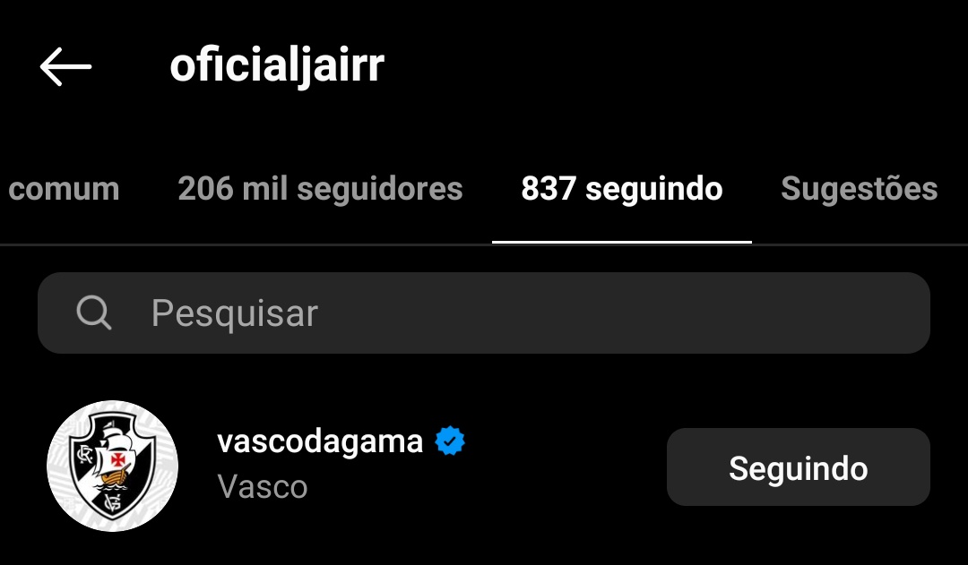 O volante Jair, que está na mira do Vasco, começou a seguir o clube no Instagram.