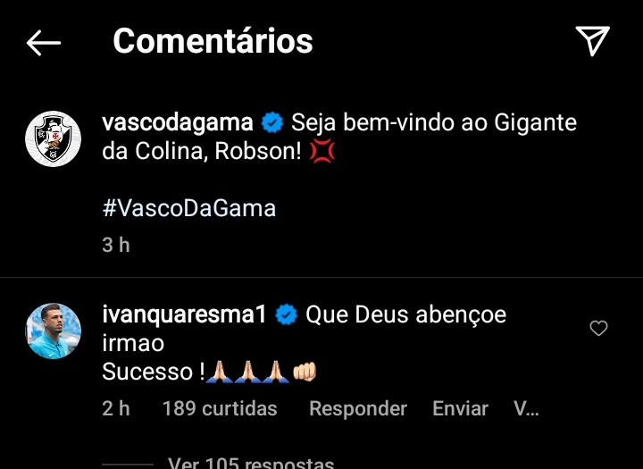 O goleiro Ivan Quaresma, que vem sendo especulado no Vasco, comentou no post de anúncio do zagueiro Robson.