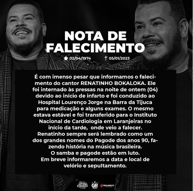 O cantor Renatinho Bokaloka morreu nesta quinta-feira (5/1), um dia após sofrer um infarto quando se apresentava no Rio de Janeiro. Aos 48 anos, o vocalista do grupo de pagode Bokaloka passou mal durante o show e foi para o hospital Lourenço Jorge, na Barra da Tijuca. De lá, os médicos o transferiram para o Instituto Nacional de Cardiologia, em Laranjeiras. Entretanto, Renato não resistiu .