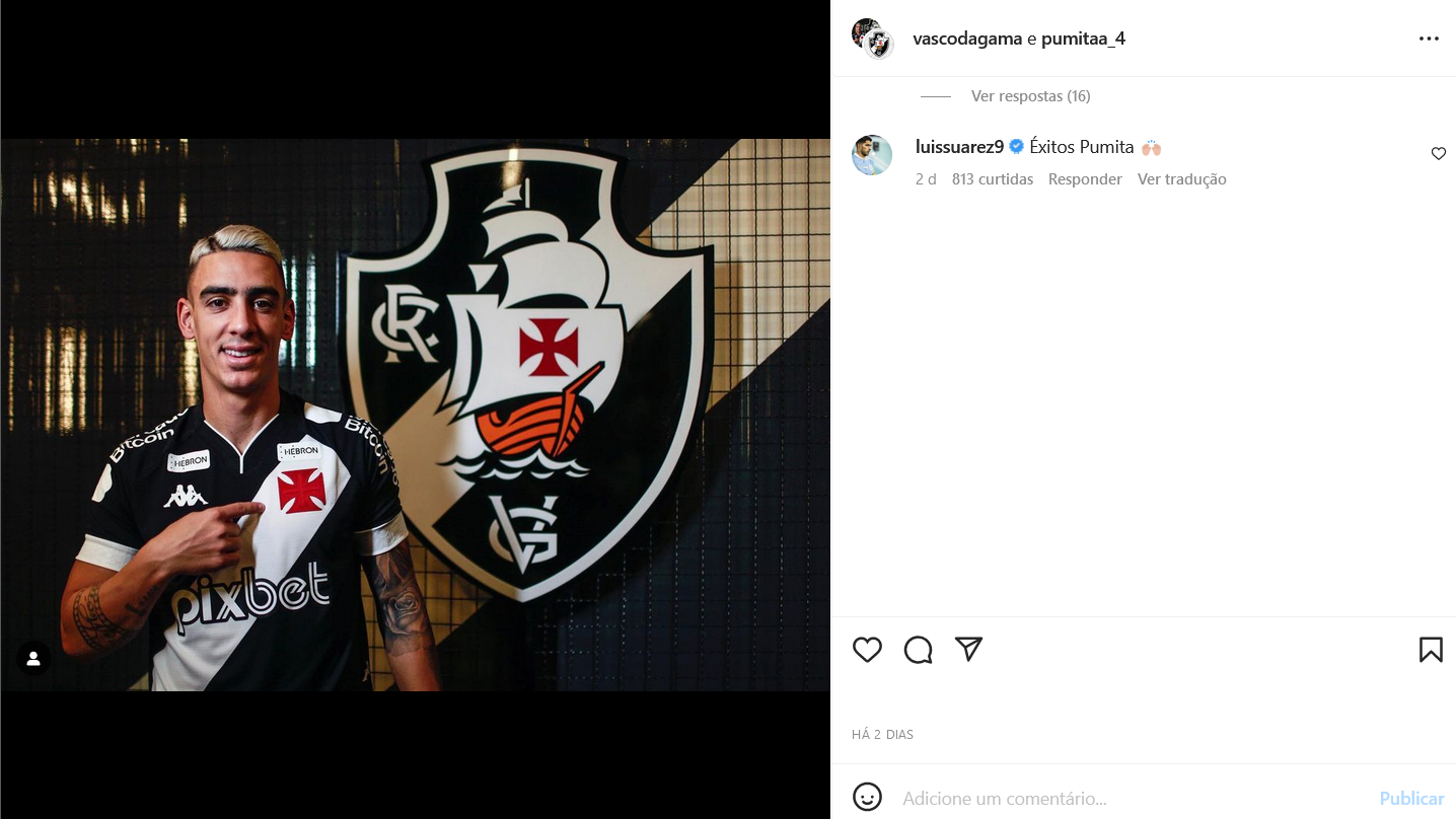 Atacante uruguaio Suárez comenta em publicação de Puma, novo reforço do Vasco: 'Éxitos'