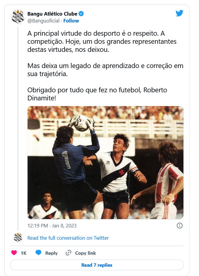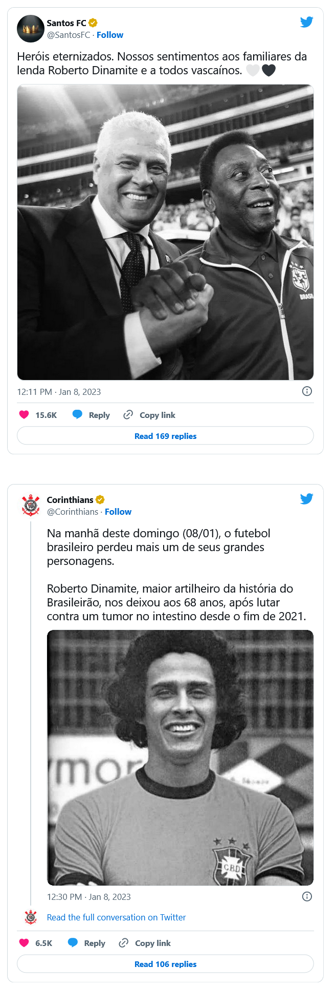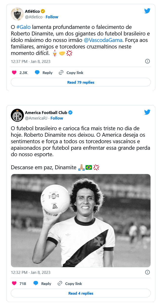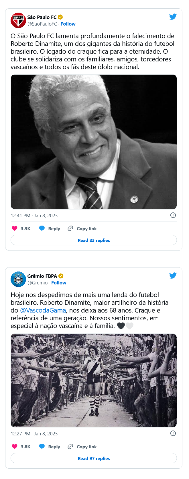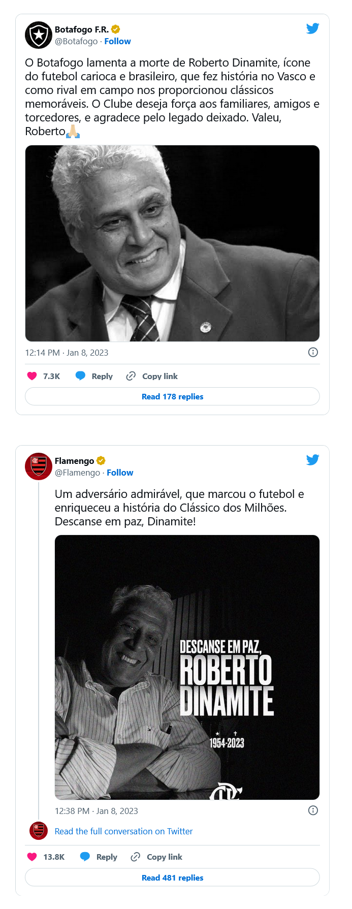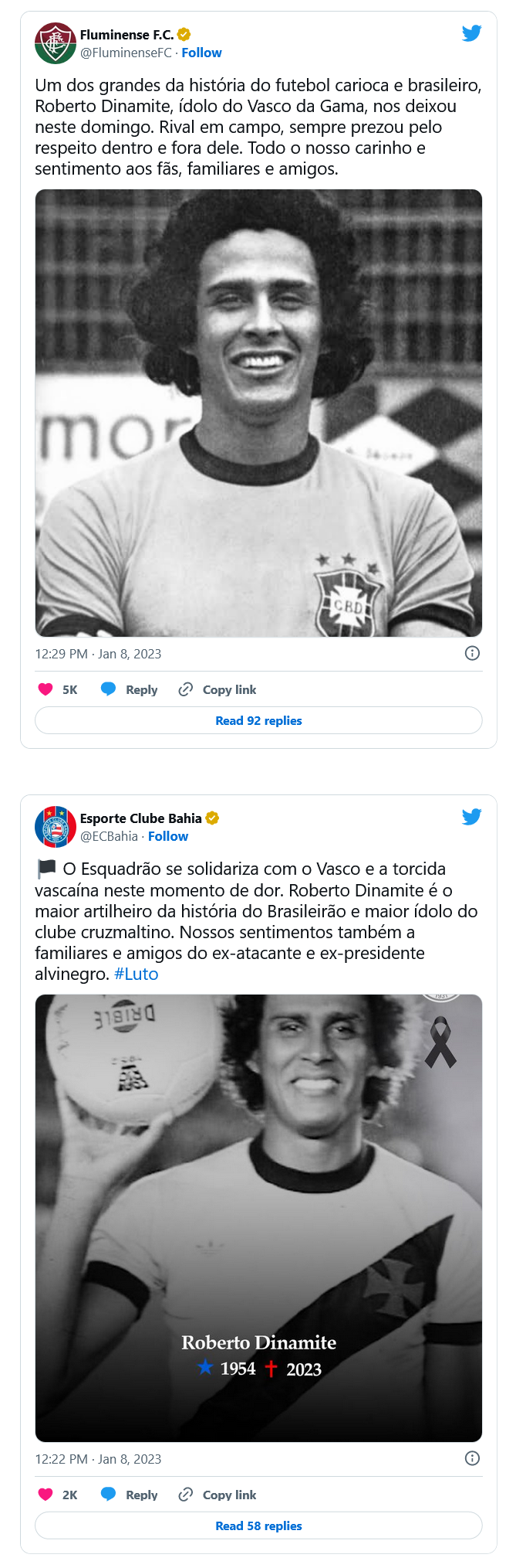 Roberto Dinamite, o maior ídolo do Vasco, morreu neste domingo aos 68 anos. Veja como os demais clubes reagiram.