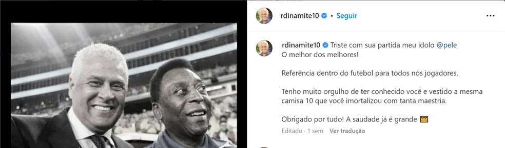 A última postagem de Roberto Dinamite em sua conta oficial do Instagram foi se despedindo de Pelé. Seu ídolo pessoal, o ex-jogador do Vasco da Gama não poupou elogios ao Rei do Futebol. Confira o post! 👇
