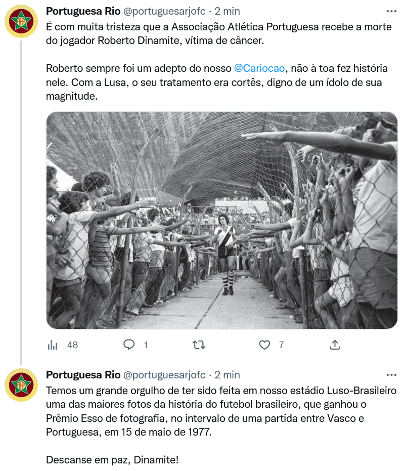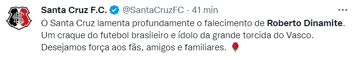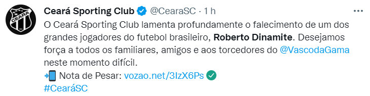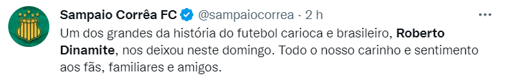 Maior ídolo do Vasco, Roberto Dinamite faleceu neste domingo aos 68 anos. Veja mais mensagens de clubes do Rio de Janeiro e do Brasil.