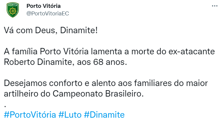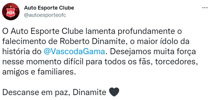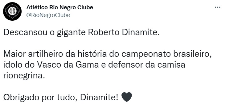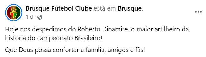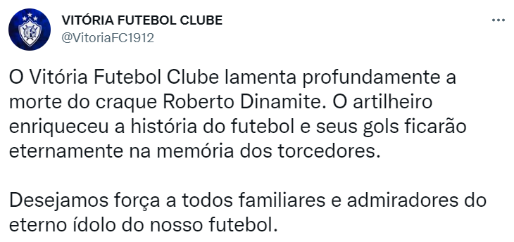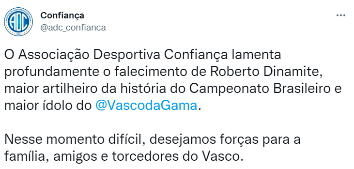 Roberto Dinamite, o maior ídolo do Vasco, faleceu no último domingo aos 68 anos. Veja mais mensagens de clubes lamentando seu falecimento.