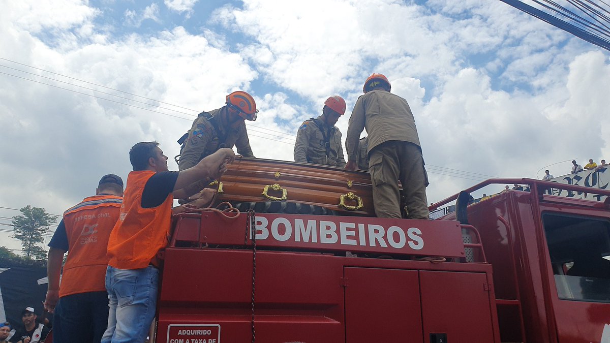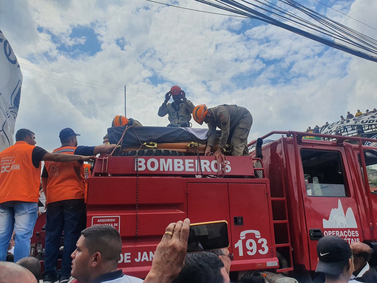 O corpo desce do caminhão para ser velado na capela do Cemitério de Nossa Senhora do Belém, em Corte 8, Duque de Caxias. #lanceDINAMITE