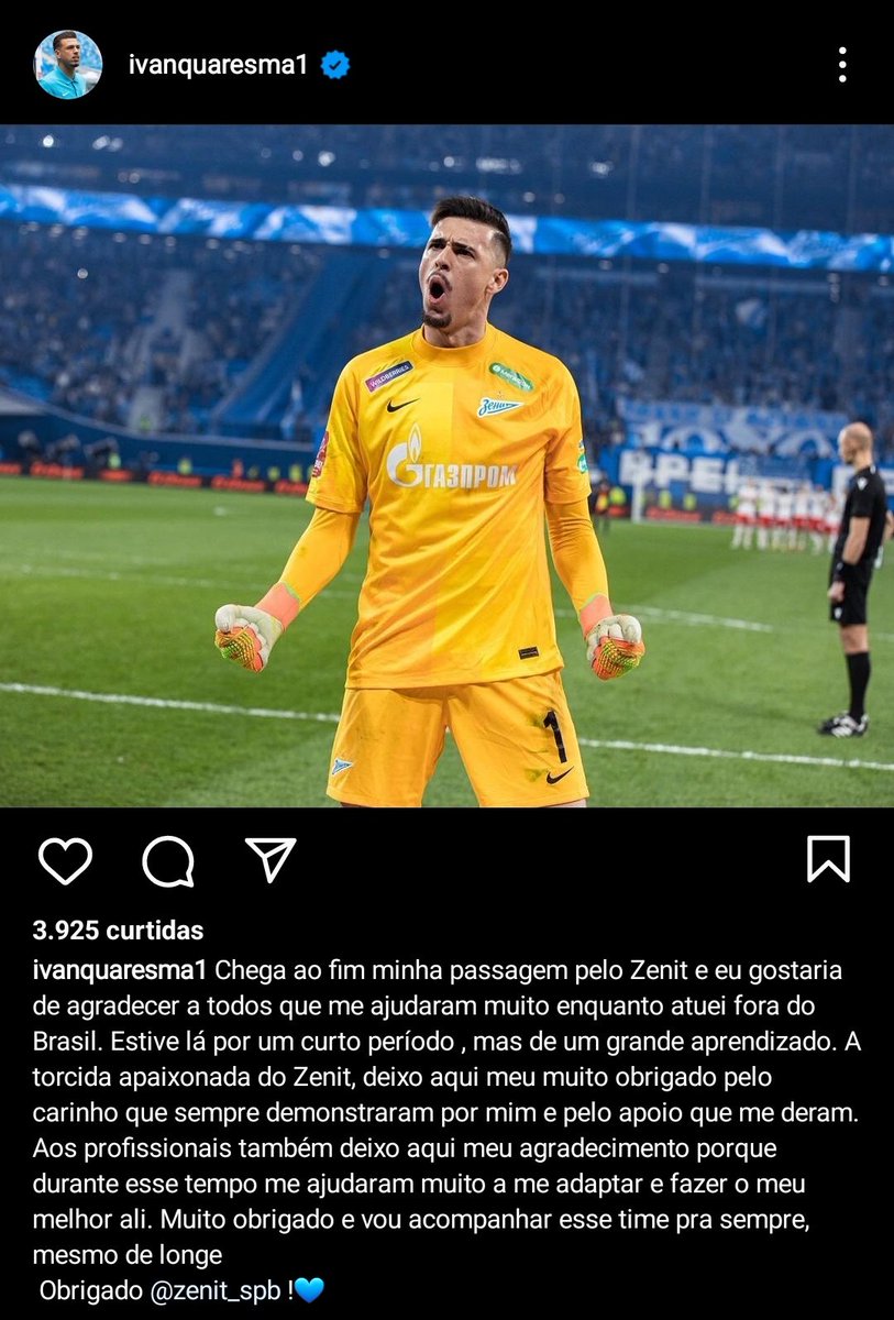 A caminho do Vasco, Ivan se despede do Zenit em seu Instagram; veja