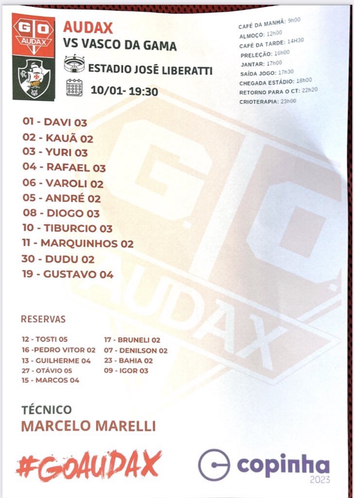 Audax escalado para enfrentar o Vasco, às 19h30, no Estádio José Liberatti. #Copinha2023