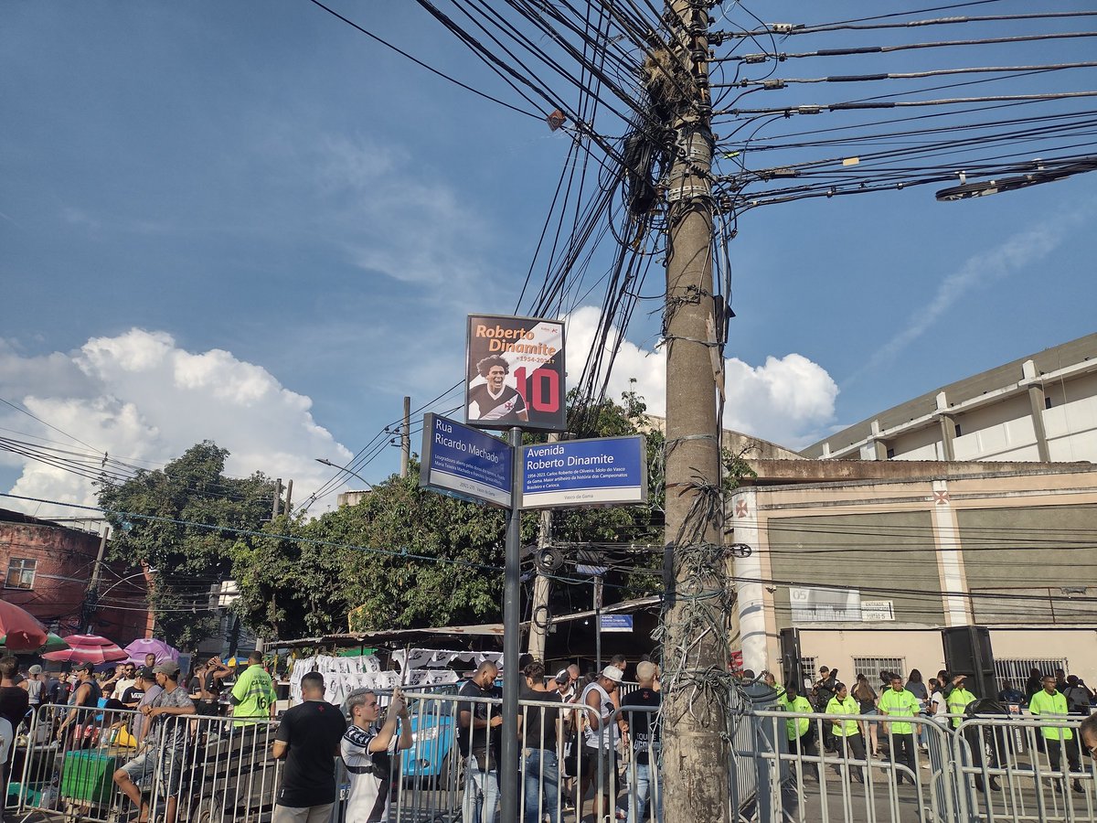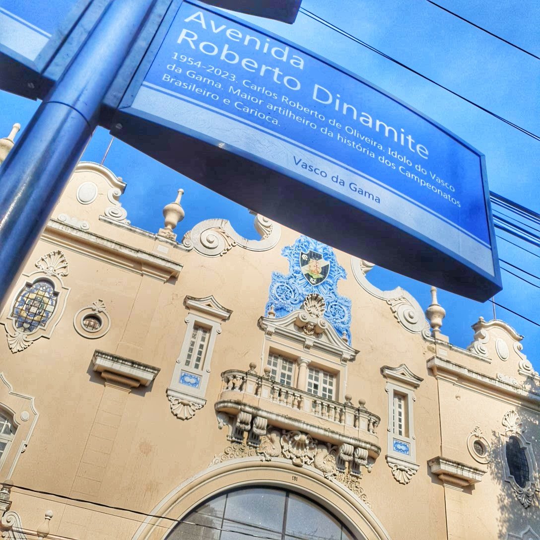 Veja placa sinalizadora da Av. Roberto Dinamite com texto sobre o ídolo vascaíno