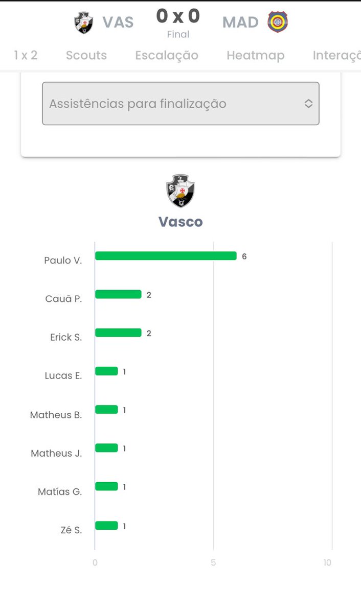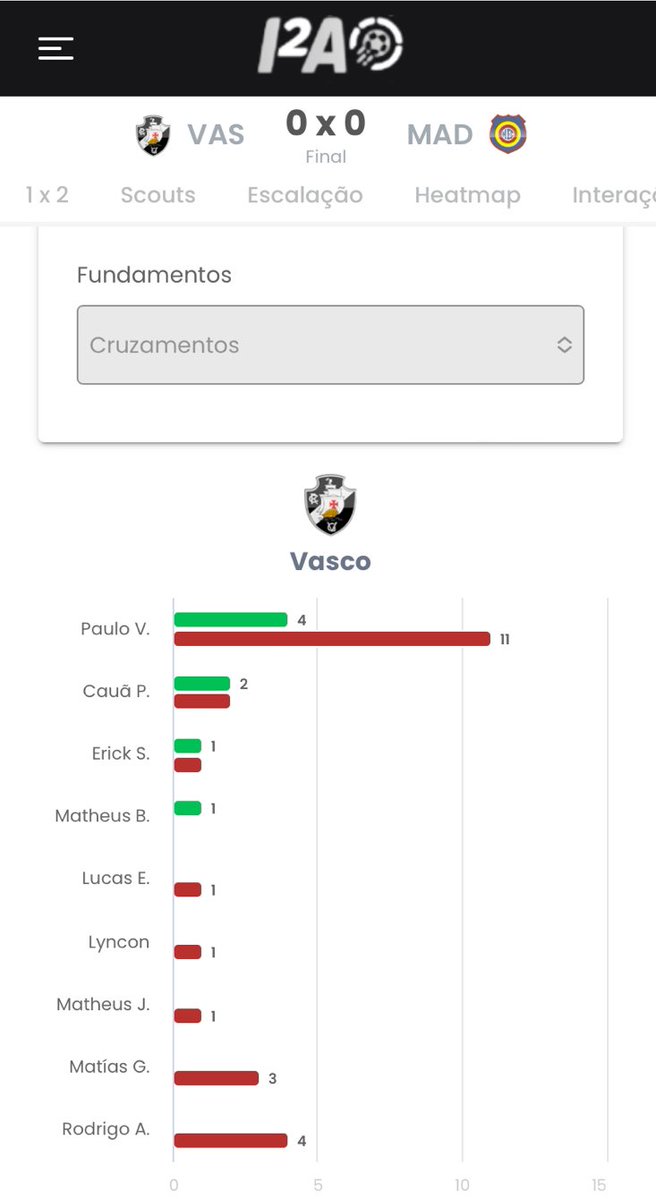 O lateral-esquerdo Paulo Victor foi o jogador do Vasco com mais: Cruzamentos certos, passes para finalização e com mais desarmes no jogo, segundo o @Footstats.