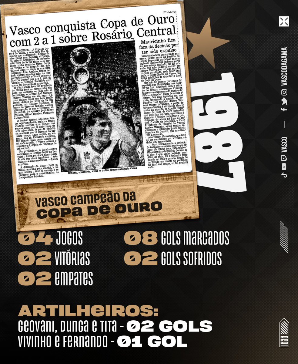 Em 1987, o Vasco conquistou a Copa de Ouro, derrotando o Rosário Central na final e com figuras marcantes no seu elenco, sendo a principal delas o #MaiorDeTodos Roberto Dinamite.