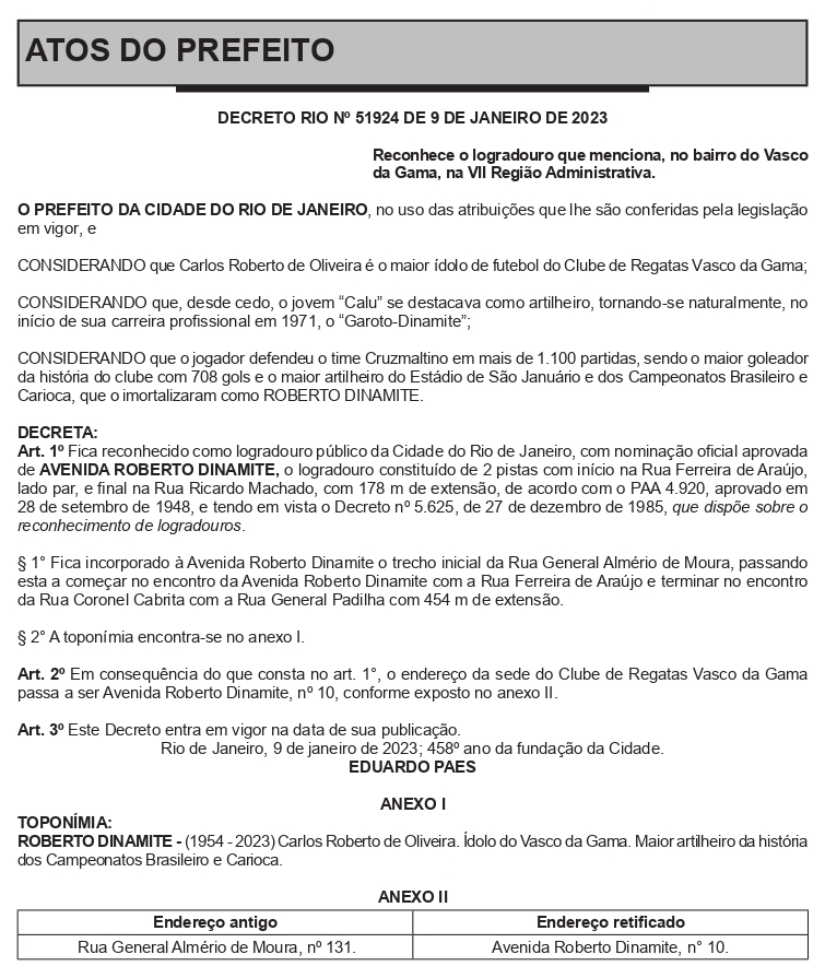 Veja a publicação do decreto de criação da Avenida Roberto Dinamite no Diário Oficial do Rio de Janeiro