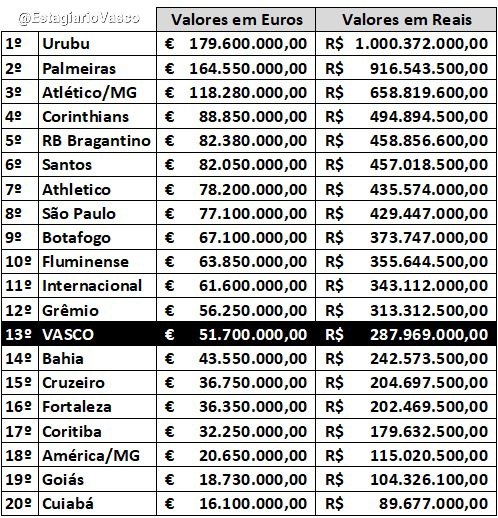 ⚠️ Segundo dados do @Transfermarkt, o VASCO possui o 13° elenco mais valioso entre os 20 times que disputarão o Brasileiro Série A 2023.