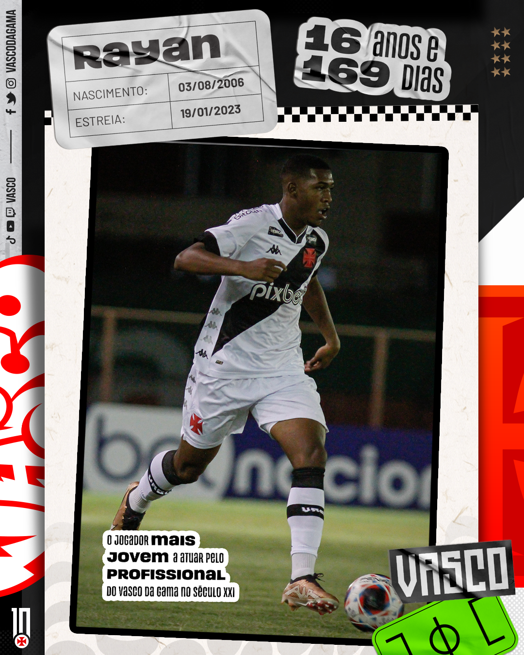 Uma das grandes promessas da #BaseForte do Gigante da Colina, o atacante Rayan se tornou o jogador mais jovem a entrar em campo profissionalmente pelo Vasco da Gama no Século XXI. Relacionado pela primeira vez para uma partida da equipe profissional, o jogador entrou em campo aos 27 minutos da segunda etapa do confronto diante do Audax Rio, pelo Campeonato Carioca de 2023.
