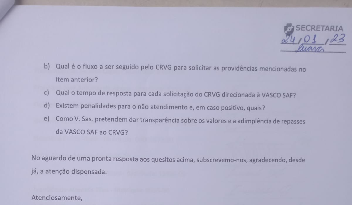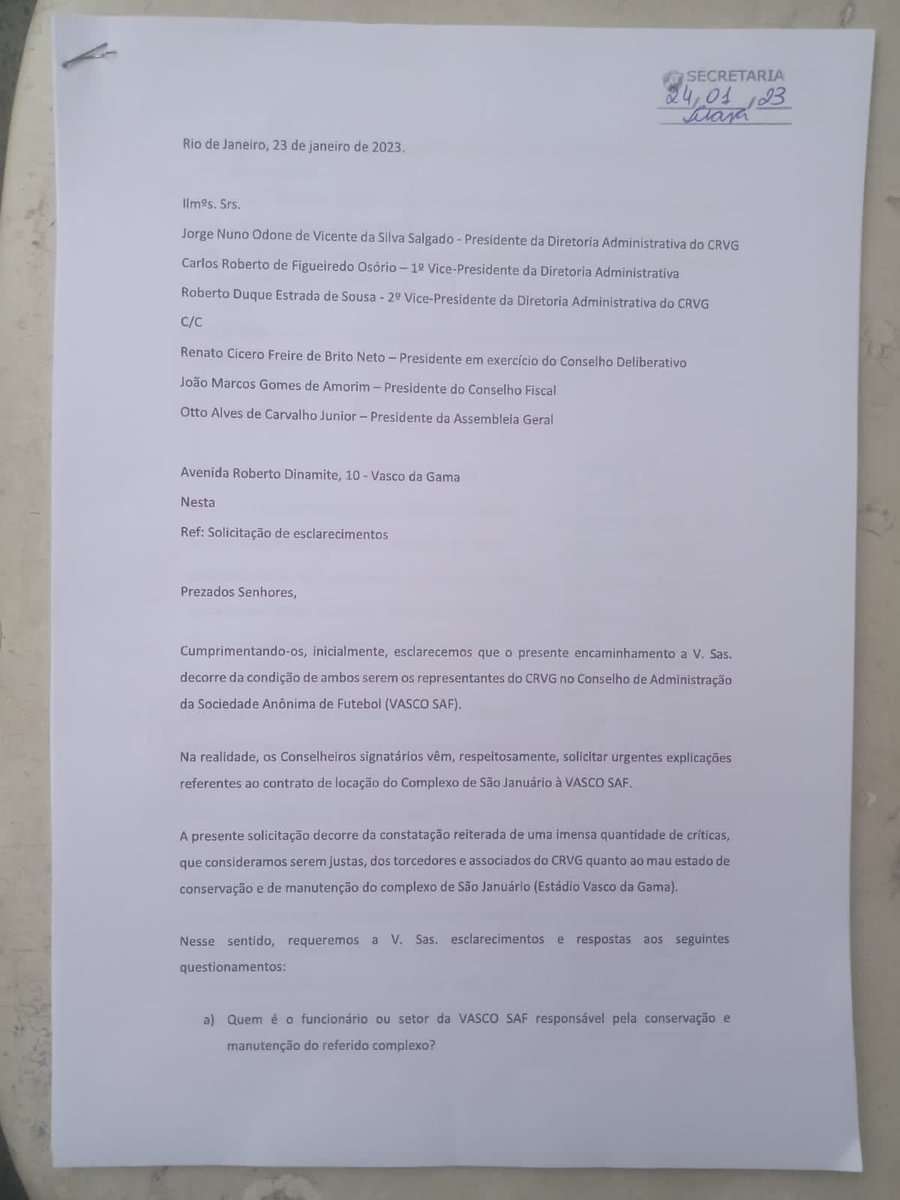 Exclusivo! Um grupo de Conselheiros do Vasco protocolou nesta tarde um documento exigindo explicações à diretoria sobre a gestão do complexo esportivo de São Januário. Foram 63 assinaturas reunidas.