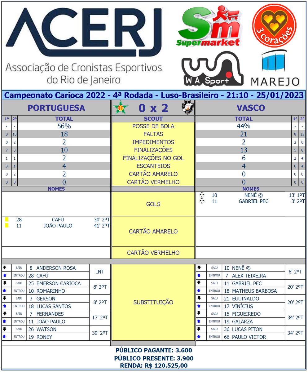 O Vasco abriu o placar no primeiro, com gol de Nenê. Já na etapa final, os cruzmaltinos ampliaram com Gabriel Pec.