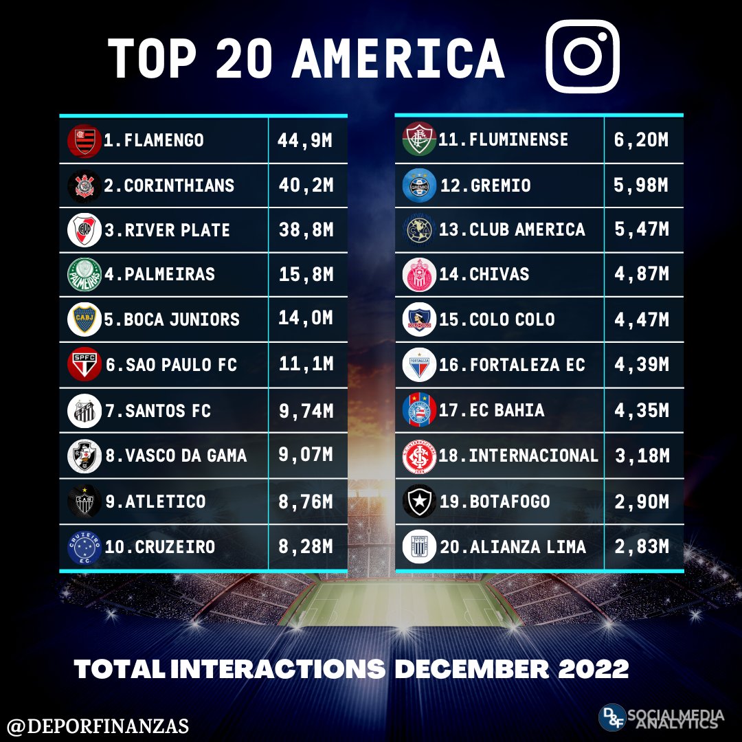 📲⚽¡Los 20 clubes de América con más interacciones en #instagram durante diciembre 2022!💙💬