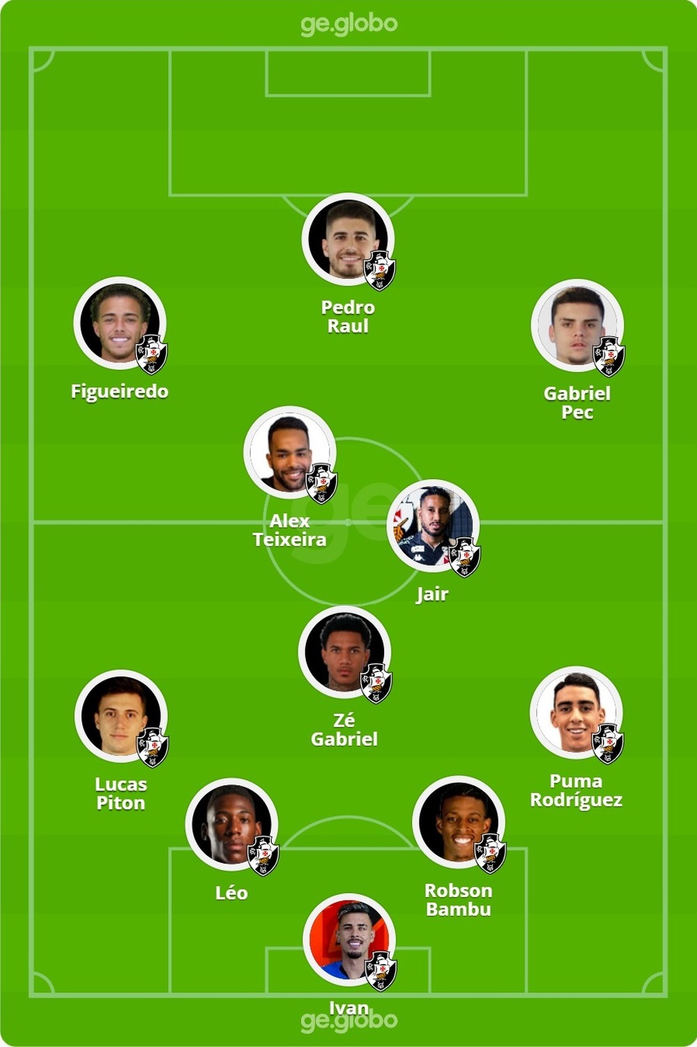 Provável escalação do Vasco: Ivan; Pumita Rodríguez, Robson, Léo, Lucas Piton; Zé Gabriel, Jair, Alex Teixeira; Gabriel Pec, Figueiredo e Pedro Raul.