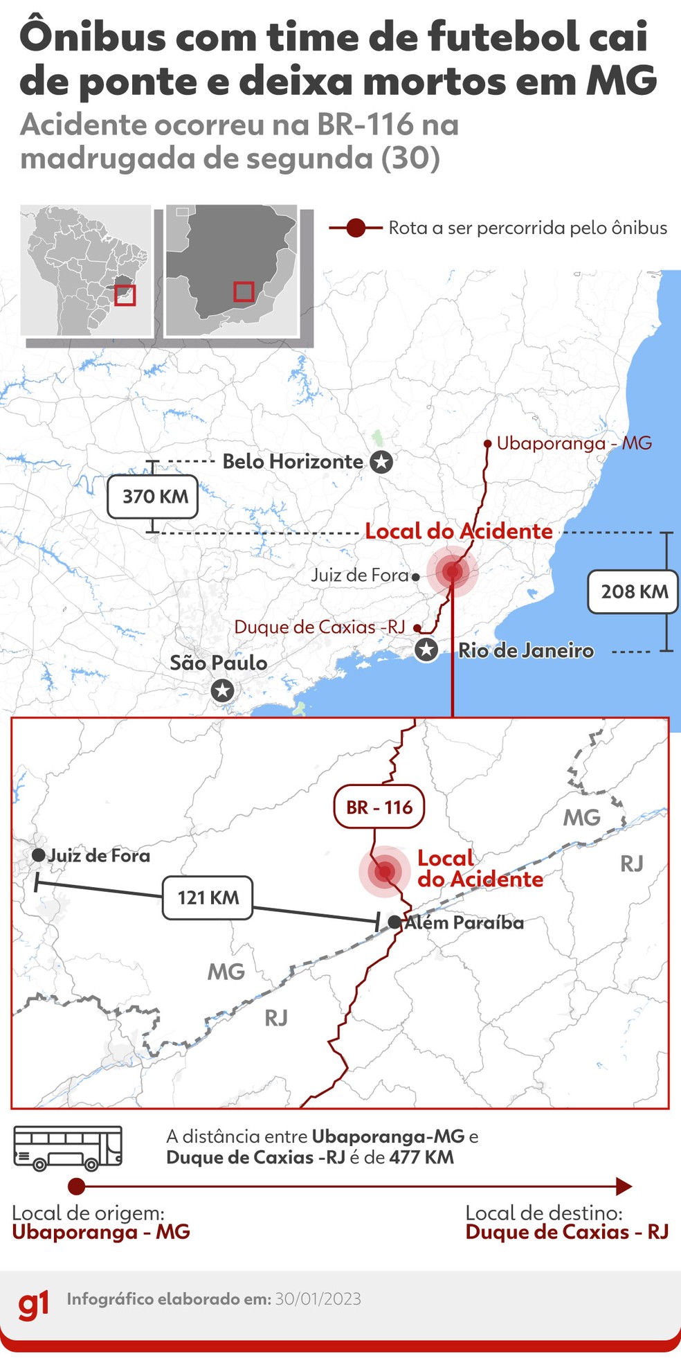 Um ônibus caiu de uma ponte de 10 metros de altura na madrugada desta segunda-feira (30) e deixou 4 mortos e 29 feridos na BR-116, em Além Paraíba. Segundo a Polícia Rodoviária Federal (PRF), o veículo levava o time de futebol Esporte Clube Vila Maria Helena de Ubaporanga (MG) para Duque de Caxias (RJ), de onde era a equipe.