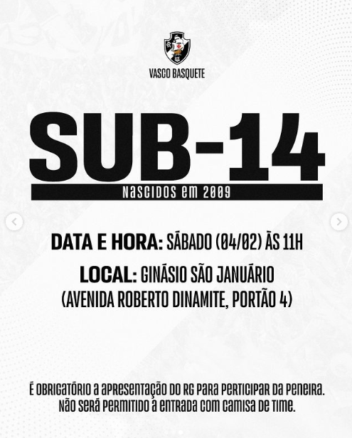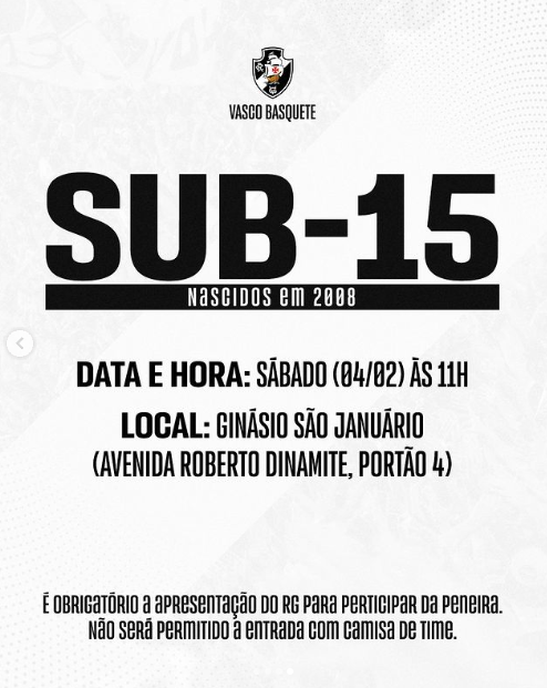 O Vasco Basquete realiza no próximo sábado (04/02) a seleção de jovens para as categorias sub-13, sub-14 e sub-15 de base.