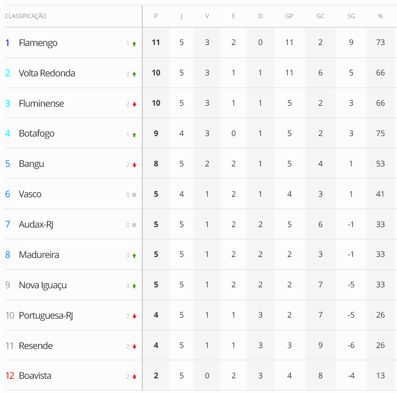Terminada a 5ª rodada da Taça Guanabara, o Vasco, que perdeu para o Volta Redonda por 2 a 1, está na 6ª colocação. Vasco e Botafogo têm um jogo a menos do que os demais participantes. Ao final das 11 rodadas, o primeiro colocado fica com a Taça Guanabara e os quatro melhores avançam às semifinais do Estadual.